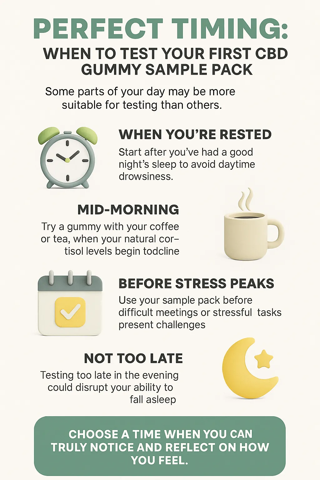 Morning testing works best for those seeking balance and mental clarity throughout the day. Taking your first gummy with breakfast allows the CBD to interact with your metabolism, helping you stay composed without feeling drowsy. Based on firsthand sampling results, users who start in the morning often report smoother energy levels and improved concentration.